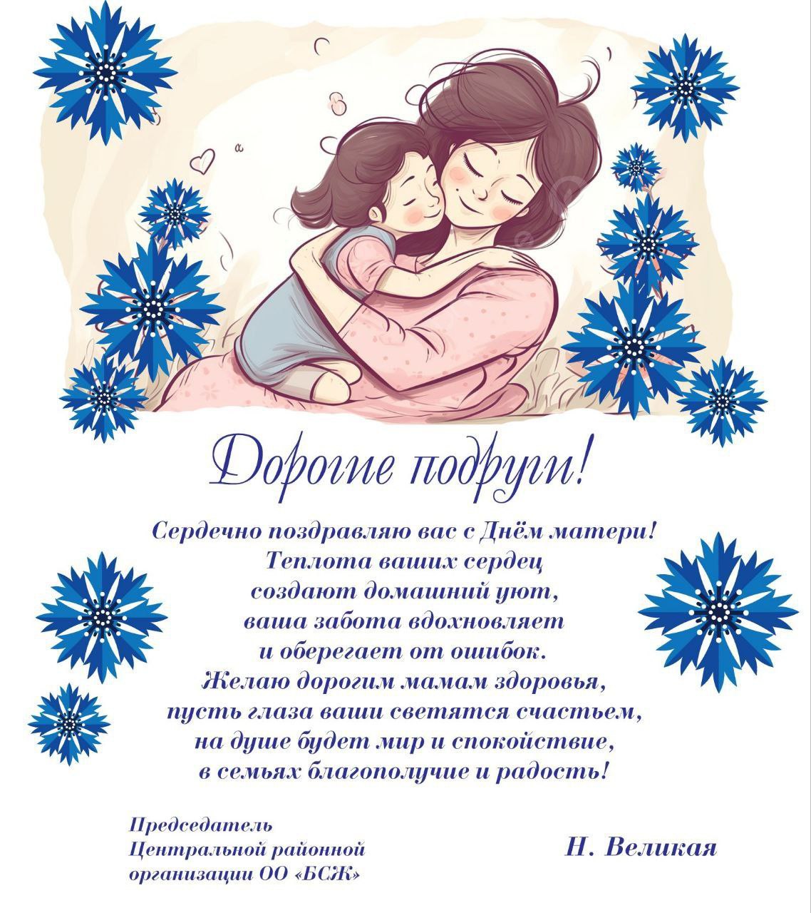 Поздравление с Днем матери председателя Центральной районной организации ОО «БСЖ» Н.М.Великой