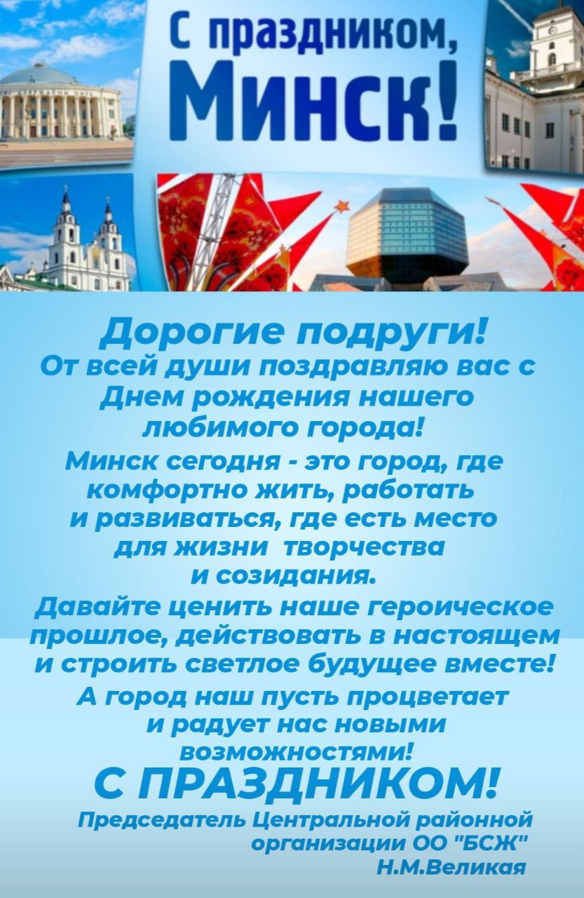 Поздравление с Днем города председателя Центральной районной организации ОО "БСЖ" Н.М.Великой