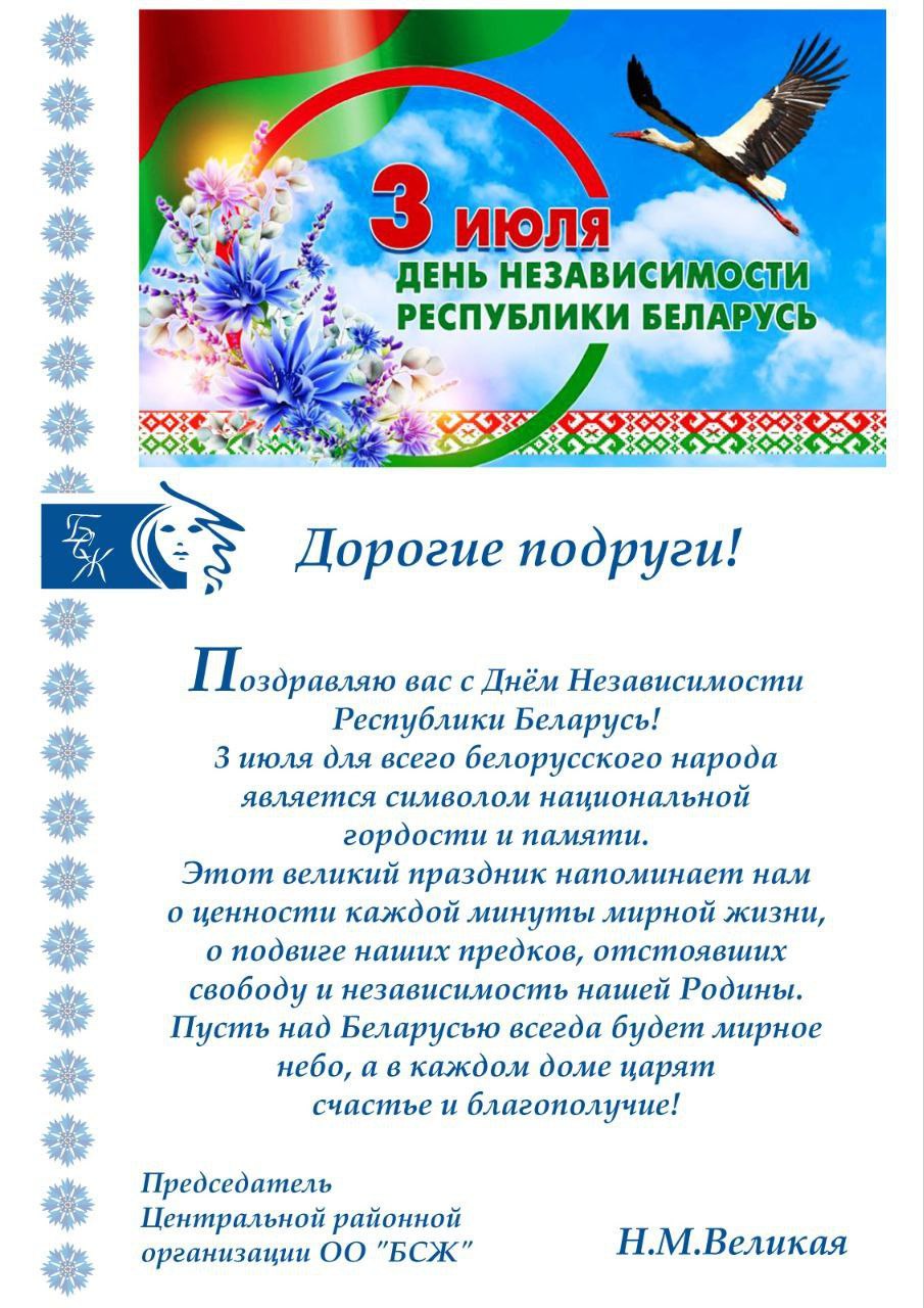 Поздравление с Днем Независимости Республики Беларусь председателя Центральной районной организации ОО «БСЖ» г. Минска»