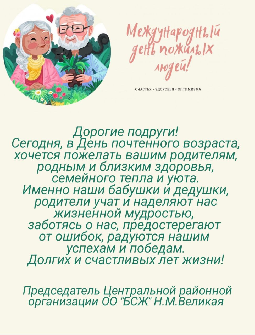 Поздравление с Днем пожилых людей председателя Центральной районной организации ОО «БСЖ» Н.М.Великой